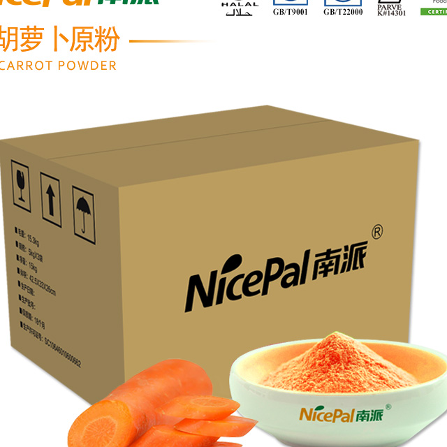 Carrot is also known as red carrot or Gan Xun. As we all know, carrot is not only rich in carotene, but also rich in vitamin B1, vitamin B2, calcium, iron, phosphorus and other vitamins and minerals. Nicepal carrot powder is selected from Hainan fresh carrot made by the world's most advanced spray-drying technology and processing, which keeps its nutrition and aroma of fresh carrot well. Instantly dissolved, easy to use.